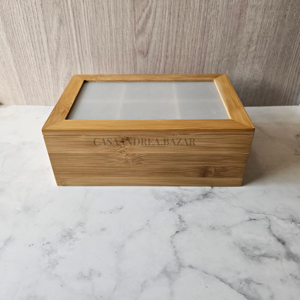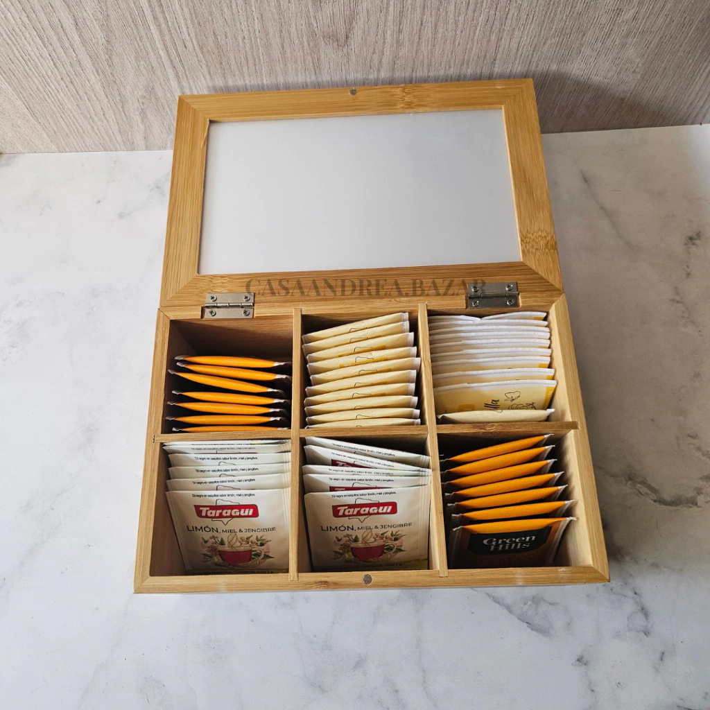 Transforma tu espacio con la Caja de bambú para guardar saquitos de té, café u otros, donde la funcionalidad se une al estilo.