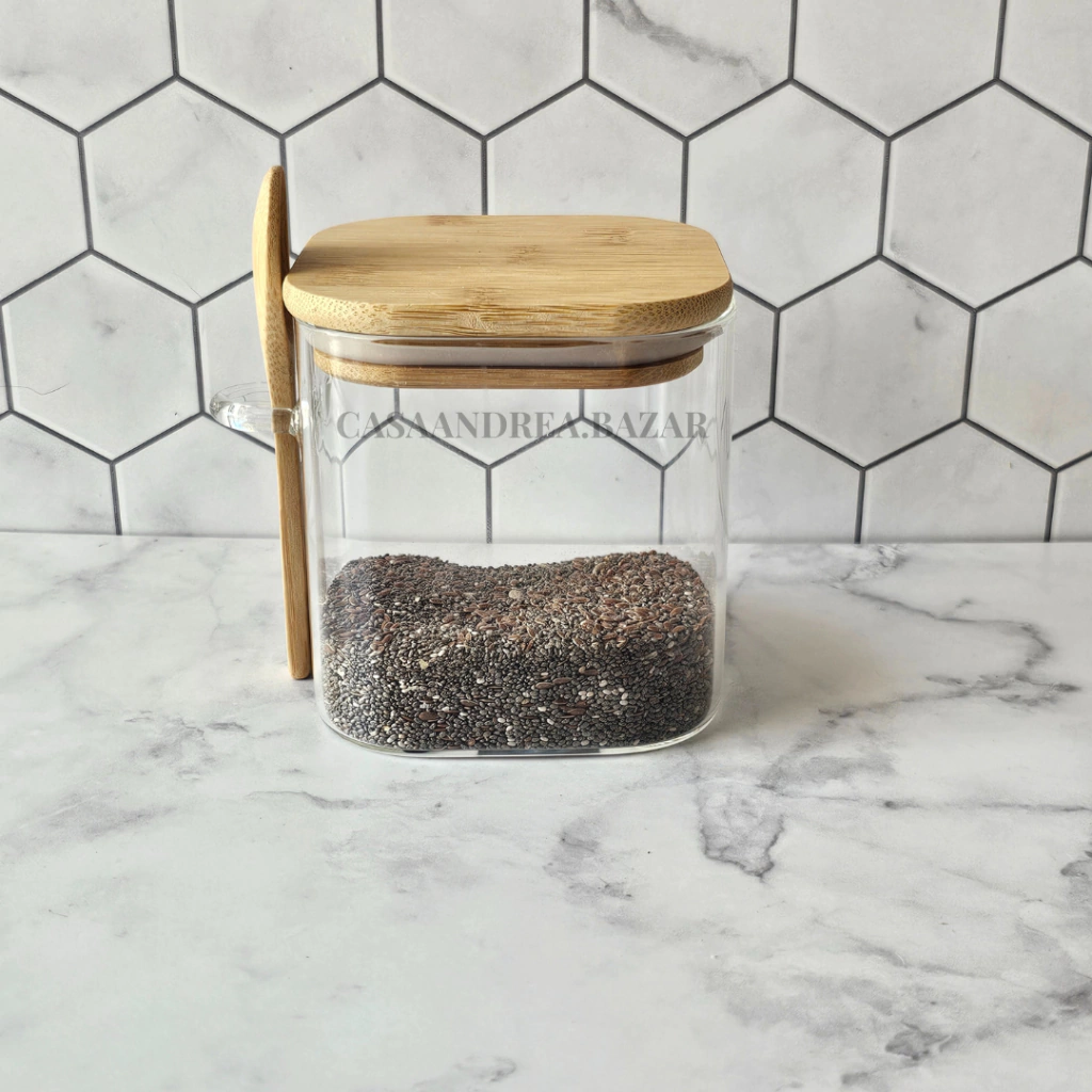 Tapa de bambú: La tapa aporta un acabado natural y asegura un cierre hermético, manteniendo la frescura de tus productos por más tiempo.
